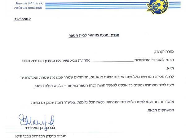 הילד שלכם חגג את האליפות עד שעה מאוחרת? במכבי ת"א חשבו על פתרון יצירתי עם פתק מיוחד למורה בבית הספר