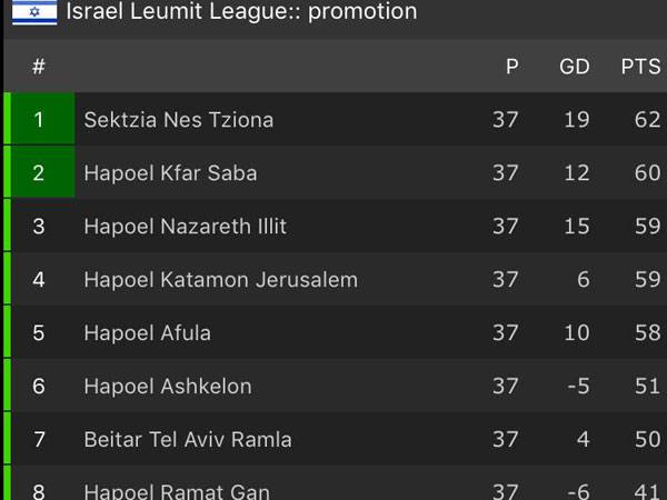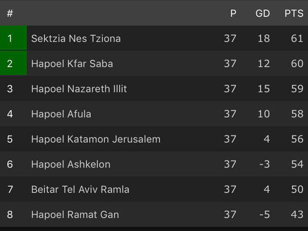 היחידה שעוד יכולה לעקוף את כפ"ס ונס ציונה היא נצרת עילית, אך היא לא תלויה בעצמה. רק ניצחון לצד איבוד נקודות של סגנית המוליכה יעזור לצפוניים, או הפסד של הסקציה במספיק שערים כדי שההפרש יהיה עדיף לקבוצה של ירון הוכנבוים.