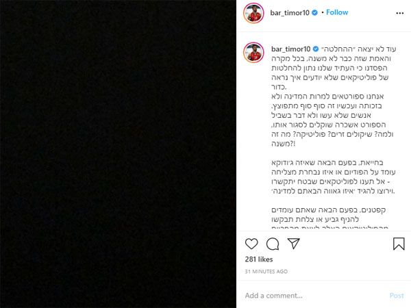 בר טימור מהפועל תל אביב פרסם פוסט מחאה באינסטגרם: "עוד לא יצאה ההחלטה והאמת שזה לא משנה. בכל מקרה הפסדנו כי העתיד שלנו נתון להחלטות של פוליטיקאים שלא יודעים איך נראה כדור. אנחנו ספורטאים למרות המדינה ולא בזכותה ועכשיו זה סוף סוף מתפוצץ. אנשים שלא עשו ולא דבר בשביל הספורט אשכרה שוקלים לסגור אותו, ולמה? שיקולים זרים? פוליטיקה? מה זה משנה?! בחייאת, בפעם הבאה שאיזה ג׳ודוקא עומד על הפודיום או איזו נבחרת מצליחה - אל תענו לפוליטקאים שבטח יתקשרו וירוצו להגיד ׳איזו גאווה הבאתם למדינה׳. קפטנים, בפעם הבאה שאתם עומדים להניף גביע או צלחת תבקשו מהפוליטיקאים האלה לצאת מהפריים של התמונה ורק אז תניפו, אולי ככה הם ילמדו. כנראה שלא..."