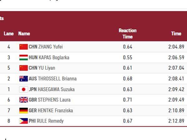 במשחה השני יופיי ז'אנג עם תוצאה אדירה של 2:04.89, הרחק מכל היתר.