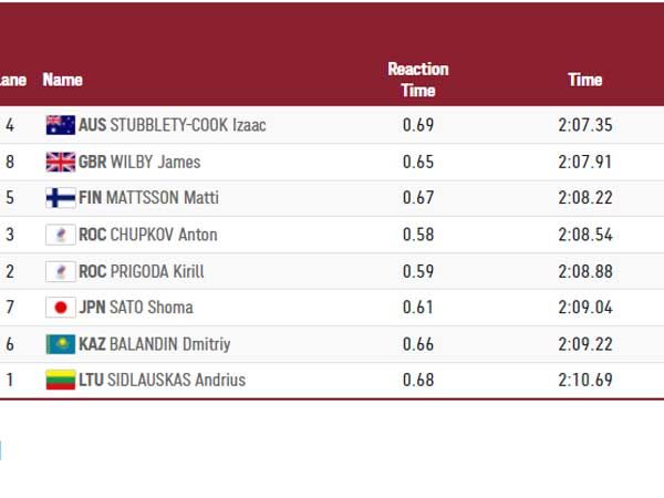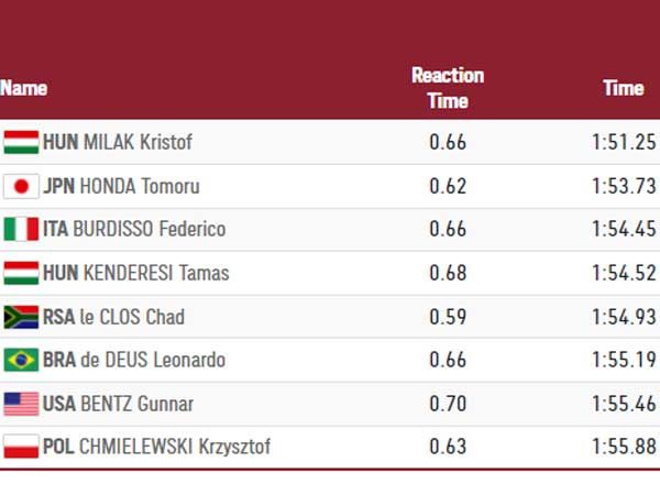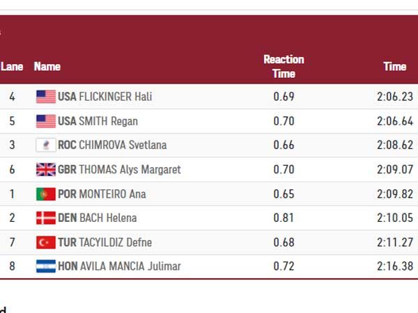 בינתיים, יצאנו לדרך עם חצאי הגמר ב-200 מטר פרפר, המקצה הראשון כבר מאחורינו צמד האמריקאיות האלי פליקינגר (2:06.23) ורגאן סמית' (2:06.64) בצמד המקומות הראשונים וסבטלה צ'ימורבה הרוסית עם 2:08.62 בשלישי