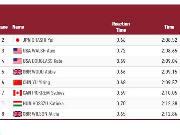 יוי אוהאשי זכתה בזהב לאחר פוטו פיניש נהדר. 2:08.52 ליפנית, אלכס וולש (2:08.65) וקייט דאגלס (2:09.04) האמריקאיות השלימו את הפודיום. שיאנית העולם, קטינקה הושו ההונגרית, סיימה במקום השביעי בלבד.