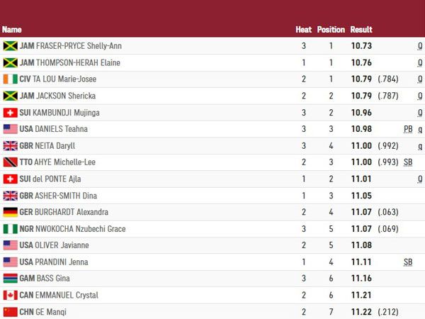 מארי ז'וזה טה לו ושריקה ג'קסון עולות אוטומטית לגמר 100 מטרים עם 10.79 שניות כל אחת. ואנחנו עדיין ברוח נגדית.