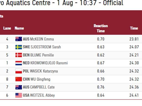 אמה מקיאון עם שיא אולימפי נוסף. 23.81 לשחיינית האוסטרלית ב-50 חופשי לנשים, 14 מאיות בלבד משיא העולם. זו התוצאה הרביעית בטיבה בהיסטוריה