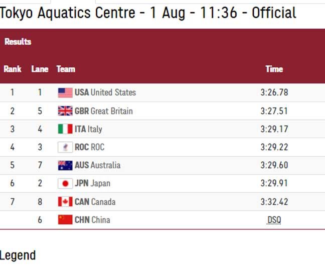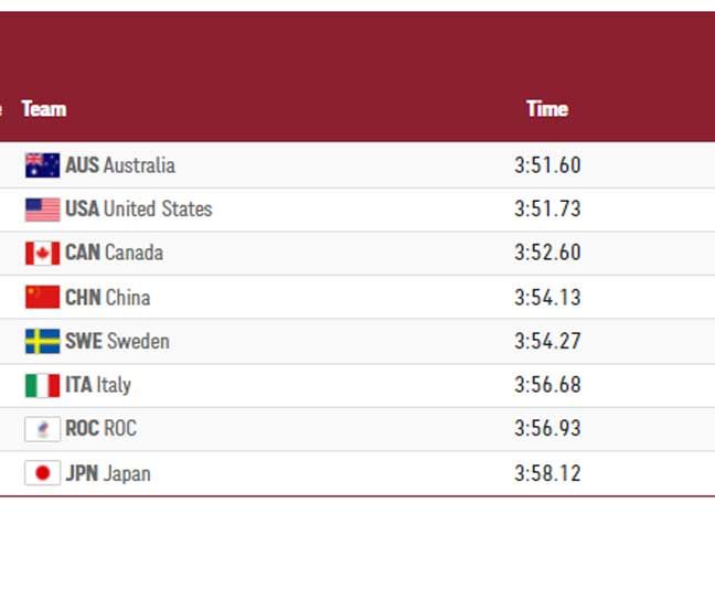 את המקום השני לקחו הרביעייה הבריטית (3:27.51) והארד הגיע לידיים של איטליה (3:29.17).