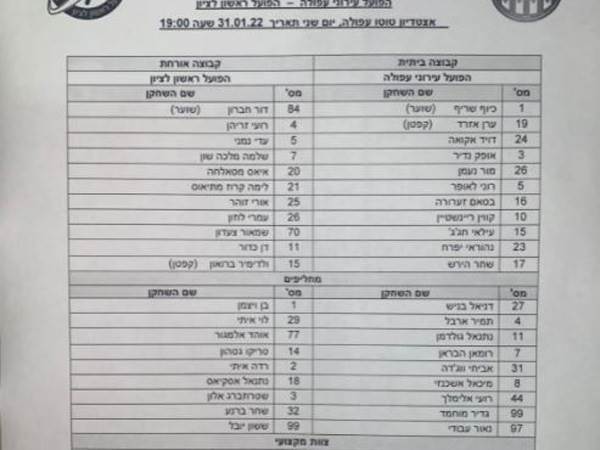 הרכב כפר קאסם למשחק הערב
