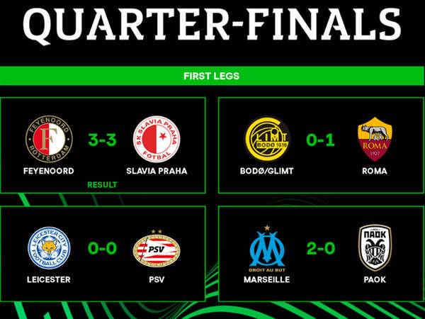 החלק הראשון של רבע הגמר בקונפרנס ליג כבר מאחורינו, כאשר ערן זהבי ופ.ס.וו איינדהובן סיימו הערב (חמישי) ב-0:0 בלסטר, רומא סמטה יתרון והפסידה 2:1 לבודה/גלימט, מארסיי גברה 1:2 על פאוק ופיינורד של אופיר מרציאנו סיימה ב-3:3 דרמטי עם סלביה פראג.