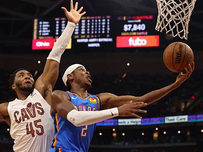 הדו-קרב בין שיי גילג'ס אלכסנדר (34 נקודות, 11 ריבאונדים, 5 חטיפות) ודונובן מיצ'ל (43 נקודות, 8 ריבאונדים) עמד בציפיות ואוקלהומה סיטי, שפיגרה ב-10 הפרש אצל קליבלנד פחות משתי דקות וחצי לסיום, סגרה את המשחק עם ריצת 5:18 בדרך לניצחון חוץ שני במזרח.