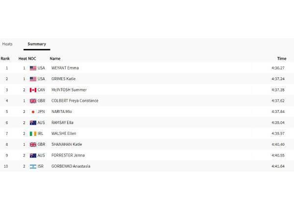 אמה וויינט מארה"ב קבעה את הזמן הטוב ביותר במשחה הראשון במוקדמות ה-400 מטרים מעורב אישי - 4:36.37 דקות. מיד גורבנקו במשחה השני.
