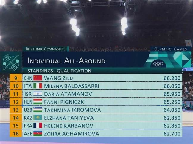 וואנג זילו הסינית, שצמודה מאוד לאטמנוב בטבלה, קיבלה ציון של 31.250 בתרגיל הסרט.