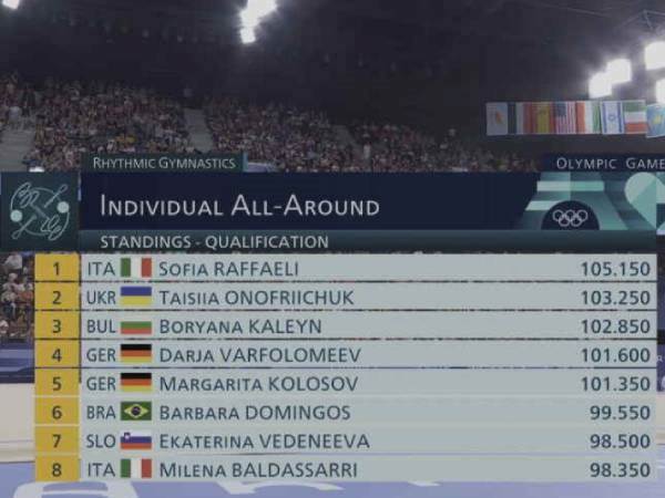 טאיסייה אונופריצ'וק האוקראינית, אולי הפתעת התחרות עד כה, עם ציון פנטסטי של 35.250 בתרגיל הכדור! היא עולה זמנית למקום ה-3