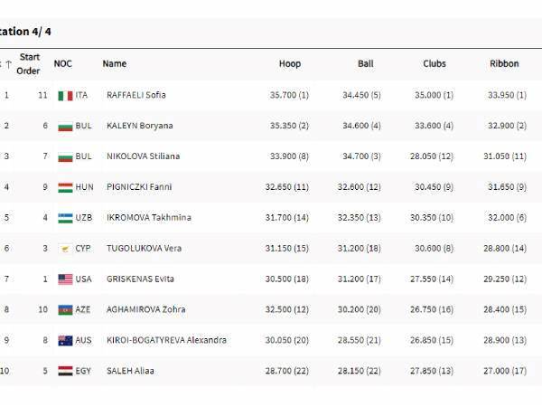 תרגיל נהדר למרגריטה קולוסוב מגרמניה, שקיבלה ציון 33.800 על תרגיל האלות בדרך למקום החמישי. אטמנוב כרגע שמינית.