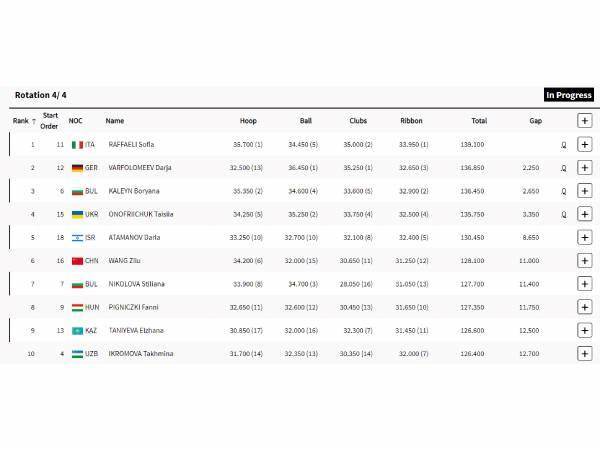 מרגריטה קולוסוב (גרמניה) קיבלה ציון 33.000 בתרגיל הכדור, מילנה בלדסארי (איטליה) עם 33.300 בחישוק ואטמנוב ירדה למקום ה-11, שכרגע לא מספיק לגמר.