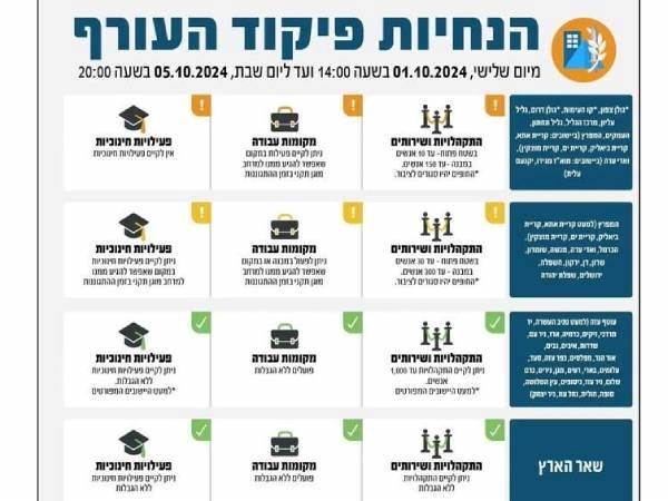 בפיקוד העורף עדכנו את ההנחיות במדינה בעקבות המצב ובהתאם להערכת המצב, הוחלט על שינוי ההנחיות לציבור, בין היתר, הגבלת הפעילות וההתקהלויות באזורי הכרמל, ואדי ערה, מנשה, שומרון, שרון, דן, ירקון, השפלה, ירושלים ושפלת יהודה