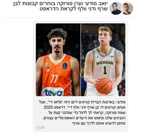 לילה טוב לכל גולשי אתר ערוץ הספורט! הלילה נלווה את הרגע המרגש של שני שחקנים ישראלים - שנמצאים על דלתות התהילה. דני וולף ובן שרף עומדים להיבחר היום (בין רביעי לחמישי) לליגת הכדורסל הטובה בעולם - במסגרת הדראפט.