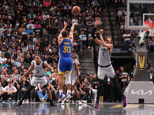 דה ז'ה וו. יומיים אחרי שצלף 46 נקודות בבית של ויקטור וומבניאמה, סטף קרי חזר ל"זירת הפשע" והעלה רמה - עם 9 מ-17 משלוש בדרך ל-49 נקודות, כולל שתיים קריטיות מהקו בשניות הסיום, שהעניקו לווריירס עוד ניצחון ענק על הספרס.